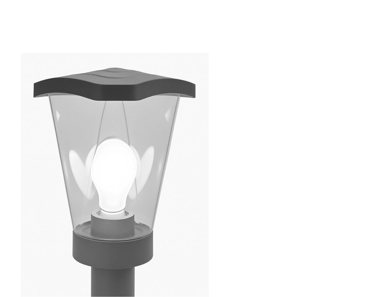 LAMBO is an outdoor post-top luminaire with a thermoplastic body and a burnished diffuser, designed to offer reliability, durability and versatility in a wide range of outdoor lighting applications. It features a ceramic E27 lamp holder and a universal base for 60 mm diameter posts, ensuring practical and secure installation. Designed for outdoor use, LAMBO guarantees an IP65 protection rating against dust and water jets and an IK07 impact resistance rating, features that confirm its robustness. The luminaire is Class II, operates on a 220–240V supply and a 50–60Hz frequency. Bulb not included. LAMBO is available in white, moss, black, graphite and Corten. The electrical components used inside each fixture in the LAMBO series are tested and certified. Rigorously designed to comply with EU directives and in accordance with the criteria of the EN 60598-1 CE standard and subsequent updates, LAMBO is manufactured in accordance with the latest sustainability standards. 5-year warranty.